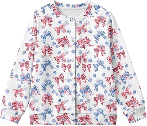 Wanyint Girls Long Sleeve Cardigan for Everyday Layering, Lightweight Printed Polyester, Button Front Top, for Kids Ages 5-16(Bow Floral Red Blue,9-10 Years)