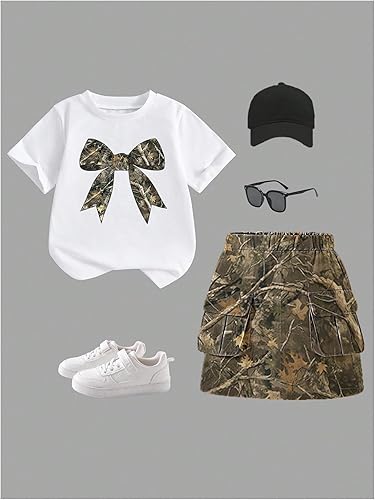 Features: 2 piece skirt set for girls, camo print, crew neck short sleeve t shirts and cargo mini skirt set, summer casual outfits