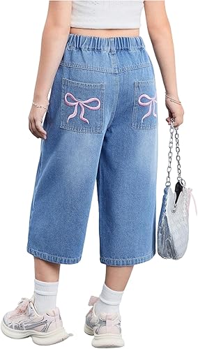 Features: Cute baggy jeans for girls, bowknot embroidery, wide leg, mid rise, pockets