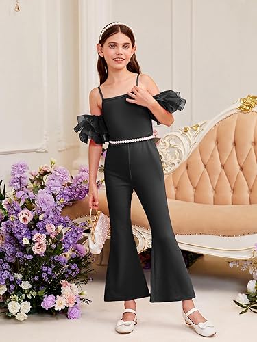 Features: cutout, spaghetti strap, short sleeve, ruffle trim, flare bell bottom jumpsuit