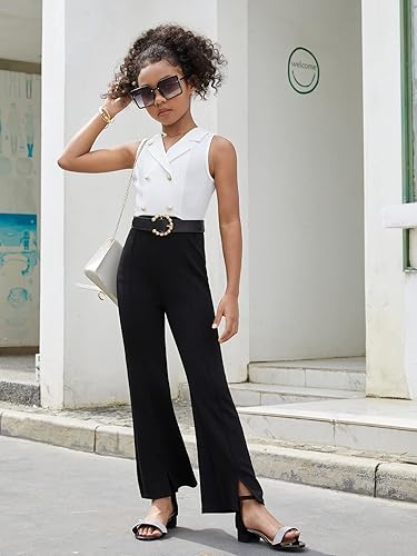 Features: color block, v neck, lapel collar, sleeveless, double breasted, split front, long pants, casual jumpsuit