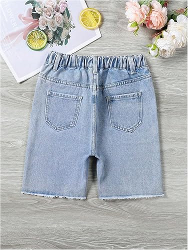 Features: Jean shorts for teen girls, heart and smiling face pattern, letter print, distressed, frayed hem, straight leg, high rise, elastic waist