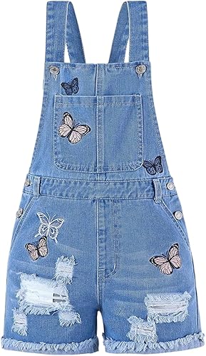 Feature: Denim, floral pattern, embroidery, sleeveless, high rise, adjustable straps, cuffed hem, distressed, ripped, casual romper for girls