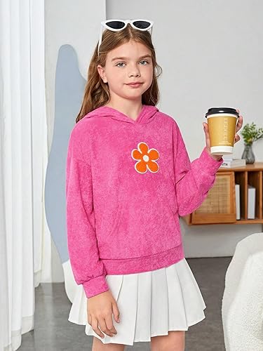 Features: floral embroidery, drop shoulder, long sleeve, kangaroo pocket, hooded pullover sweatshirts for girls