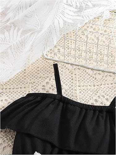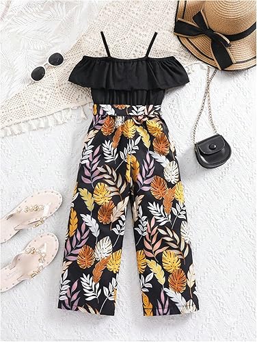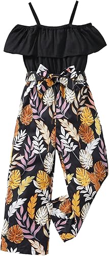 Feature: Girls jumpsuit, floral pattern, cold shoulder, short sleeve, square neck, ruffle trim, high waisted, wide leg, long length, bohemian style, with belt
