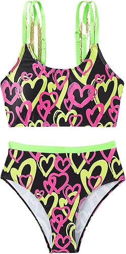 Features: heart graphic print, sleeveless, spaghetti straps, high waisted, adjustable straps, 2 piece swimsuit for girls