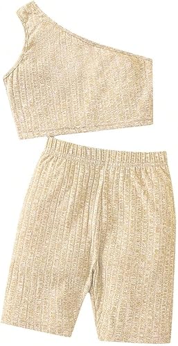 Features: ribbed, 2 piece outfits for girls, one shoulder top and shorts set, sleeveless, biker shorts set
