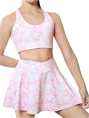 WDIRARA Girl's Workout Outfits Crisscross Crop Tank Top and Flare Skort Skirt Set(Pink,8 Years)