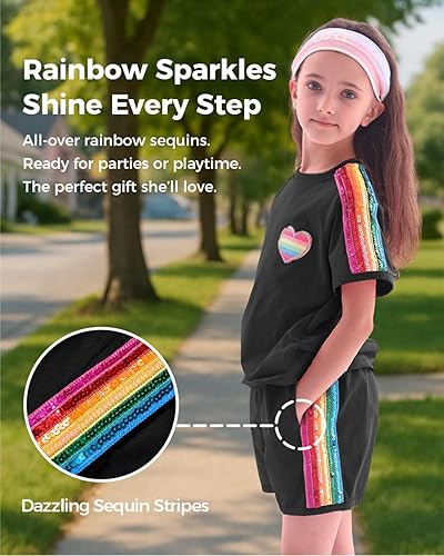Stylish & Functional Design: The set features trendy rainbow sequin stripes along the sides of both the T-shirt and shorts, adding a vibrant pop of color and fun. The T-shirt is adorned with a playful heart-shaped patch on the front, while the shorts come with convenient side pockets. Both pieces are finished with edge stitching to prevent sequin friction, ensuring maximum comfort and durability.