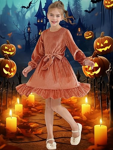 Twirl‑Ready A‑Line Fit: Long sleeves with gentle elastic, pretty pleats, classic crew neck, knee‑length A‑line silhouette and a ruffled hem; the self‑tie sash bows in the front or back for a custom look; pull‑on style (no zipper), colorfast velvet resists pilling and fading