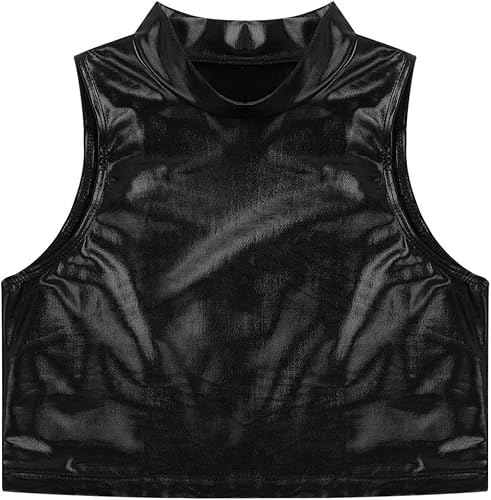 Sleeveless, turtleneck, glossy metallic appearance. Solid color, pull on closure