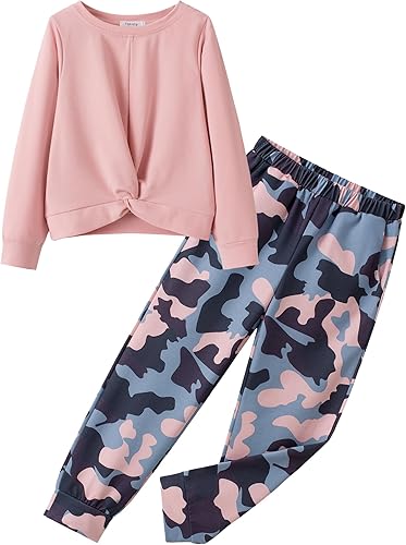 Twist Front Shirt & Camo Pants>> Girls Sweatsuit Set come with tops and pant. Long sleeve shirts is stylish with the twist font and classic round neck which is a nice touch and makes the top even more classy and adorable. The camo pants with a an elastic waistband for easy on and off. Two side pockets for storing treasures that are found outside playing, hiking, and exploring.