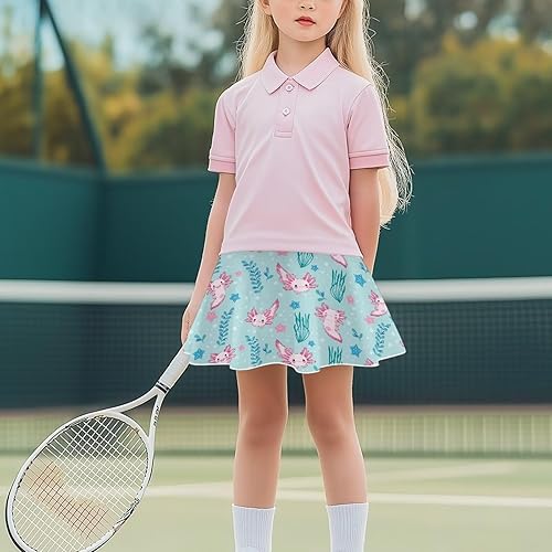 YEXIATODO Girls Tennis Skirts with Pockets High Waisted Athletic Skorts Inner Shorts Sports Golf Running Skirt for 5-14 Years(Cute Axolotl,13-14 Years)