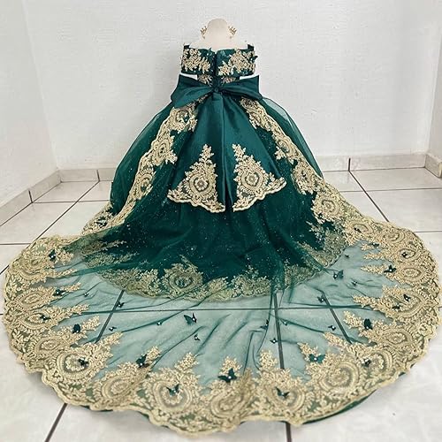 Features:Gold Lace Flower Girl Dress with Bow; Glitter Sequin Kids First Communion Dress with Train; off Shoulder Beaded Pageant Dresses for Girls; Puffy Tulle Sequin Kid Ball Gown