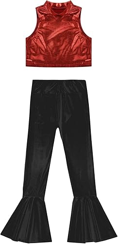 Kids Girls Metallic Sleeveless Crop Top with High Waist Bell-bottoms Pants.