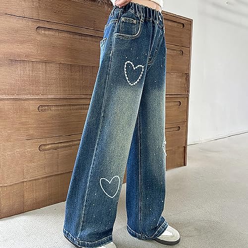 Youth Girls Heart Embroidery Pearl Wide Leg Jeans Washed Elastic High Waist Denim Pants Cute Trousers for Kids Girls(Blue,11-12 Years)