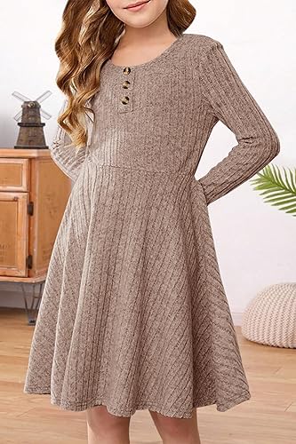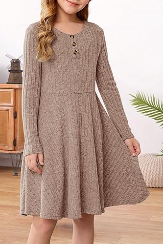 Features: Girls Sweater Dress features a crew neck button front and ribbed knit textures design, long sleeve, solid color, elastic waist, pleated skirt, swing and flare, a-line tunic dress, two side pockets, knee length