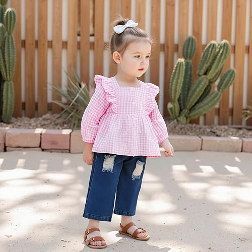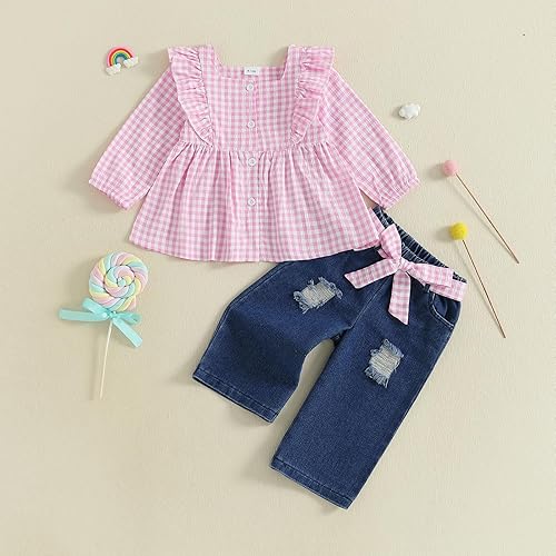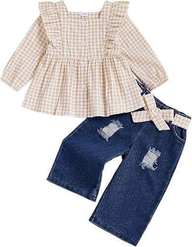 Feature: Kids girls clothes; Tops with puff long sleeve, square neck, smocked detail, plaid print; Flare Jeans with elastic waistband, side pockets, bow details; Easy to put on and take off;Toddler sets for girls, sweet and chic style; Make your princess more adorable and eye-catching, standing out in the crowd; She’ll win lots of compliments in our girls two piece outfits